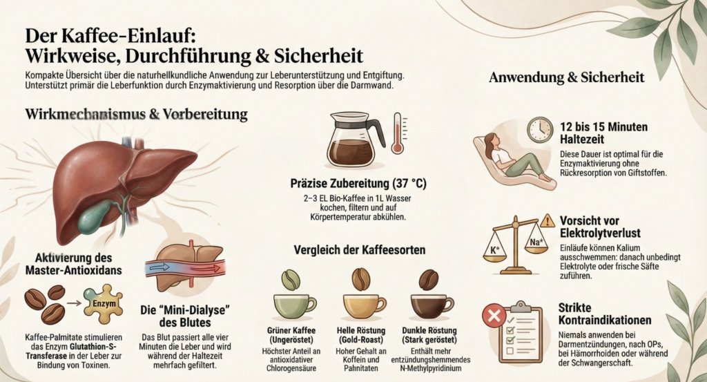 Egal, ob du dich für den klassischen Röstkaffee entscheidest oder die sanftere, hochgradig antioxidative Variante mit dem ungerösteten grünen Kaffee bevorzugst – entscheidend ist immer die absolute Präzision bei der Durchführung. Die exakte Körpertemperatur, das Weglassen von zellulosehaltigen Papierfiltern (damit die wertvollen Entgiftungs-Fette im Kaffee bleiben) und das zwingende Auffüllen deiner Elektrolyte und Mineralien im Nachgang machen den Unterschied zwischen einer heilsamen Anwendung und einem ernsthaften gesundheitlichen Risiko aus.